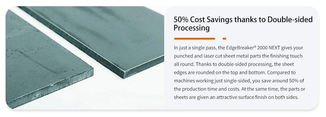 The EdgeBreaker® 2000 NEXT processes sheet metal parts which are punched or laser cut from both sides simultaneously. This double-sided edge rounding saves more than 50% of the time. These time savings are possible since this deburring machine not only eliminates the need for a second pass, but also the need to remove, flip, and reinsert the parts.
